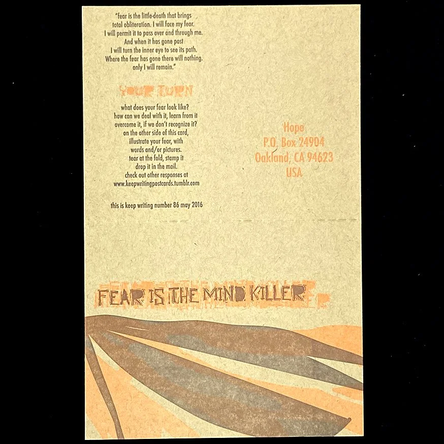 Inspired by reading dune, and experimenting with more two-colored text and big blocks of color, I asked recipients to write about their fears.
