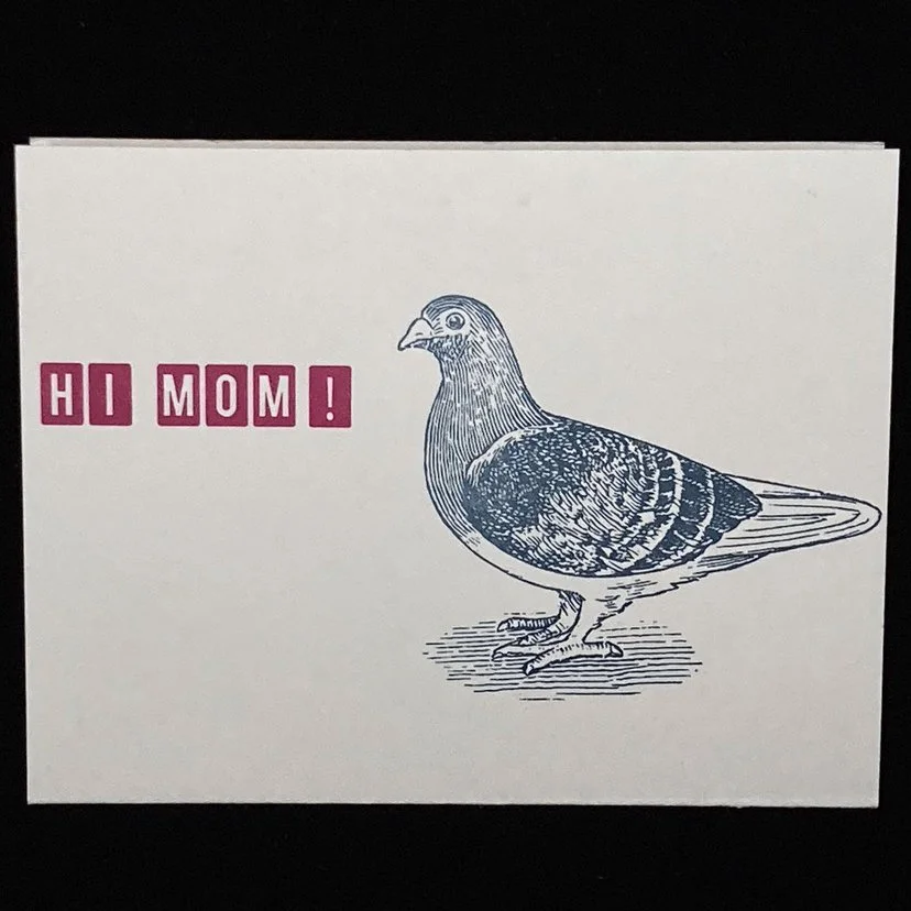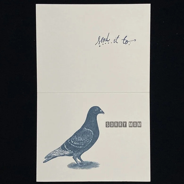 One side is a pigeon that says “sorry mom” and the other is a different pigeon saying “hi mom.” A pigeon for all occasions.