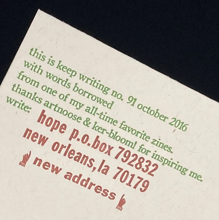 I bet none of you are surprised that within my first month back in Louisiana, I found a printshop to join. I think the green text was printed before I left Oakland, maybe? But I was waiting until I secured a new address to finish the card with handset type from Baskerville Studio.