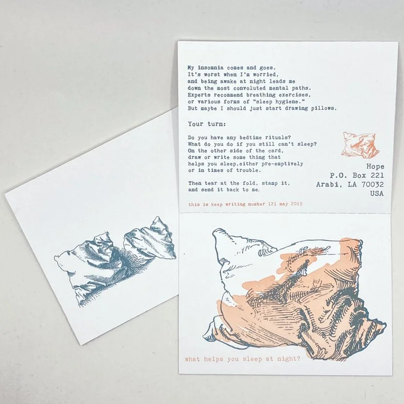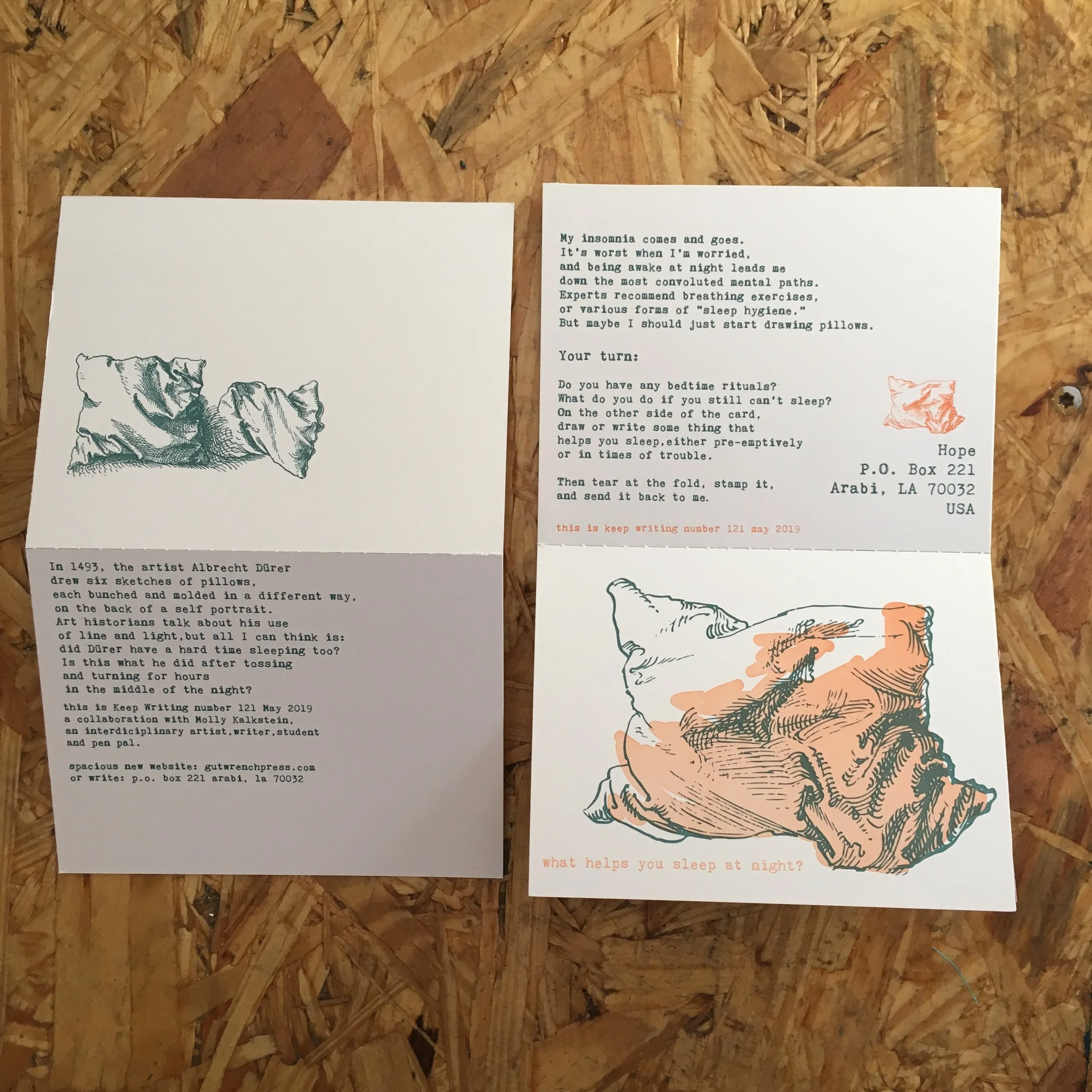 I don’t remember why Molly K. agreed to collaborate with me on this month. We’ve been penpals since we were 18 or so, and have even met in person a few times. For this card, she wanted to ask about how you prepare for sleep, and suggested the drawings of Albrect Durer for an illustration.
