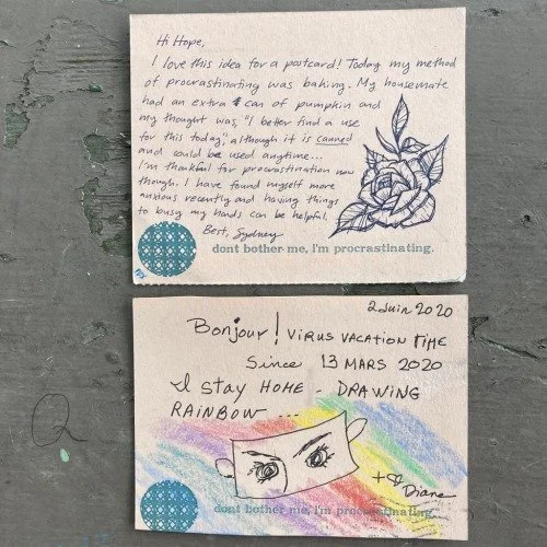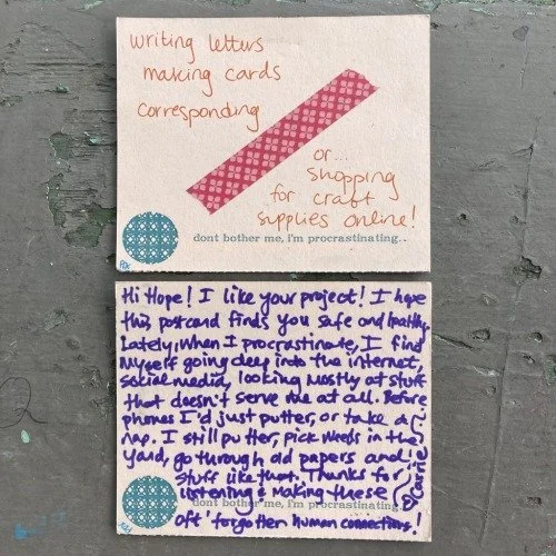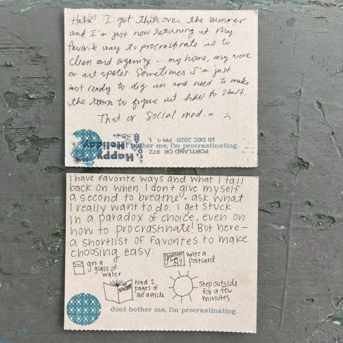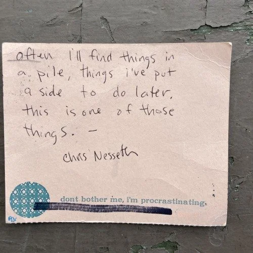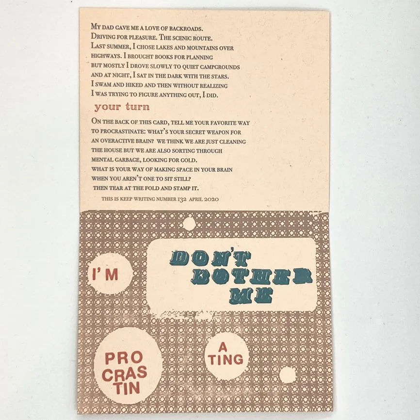 The last of the cards printed on my windmill till I moved it to Portland in fall 2020, this card is about procrastination, a favorite pastime of mine. At best, I love a meandering road trip, with time to look at stars and swim and all that.