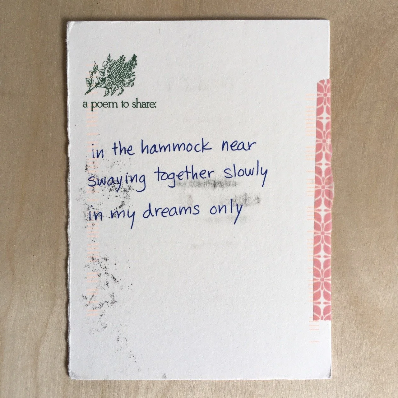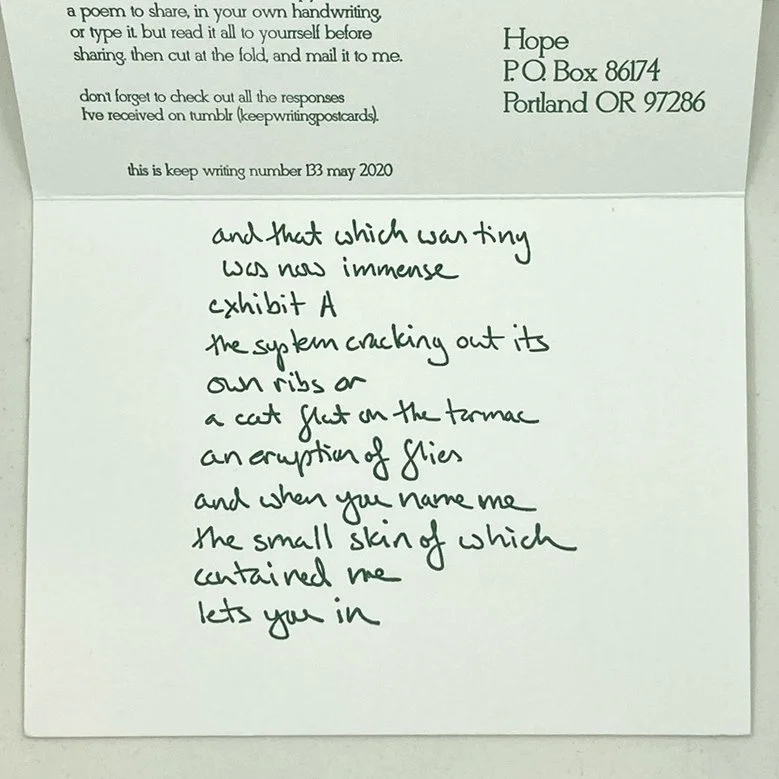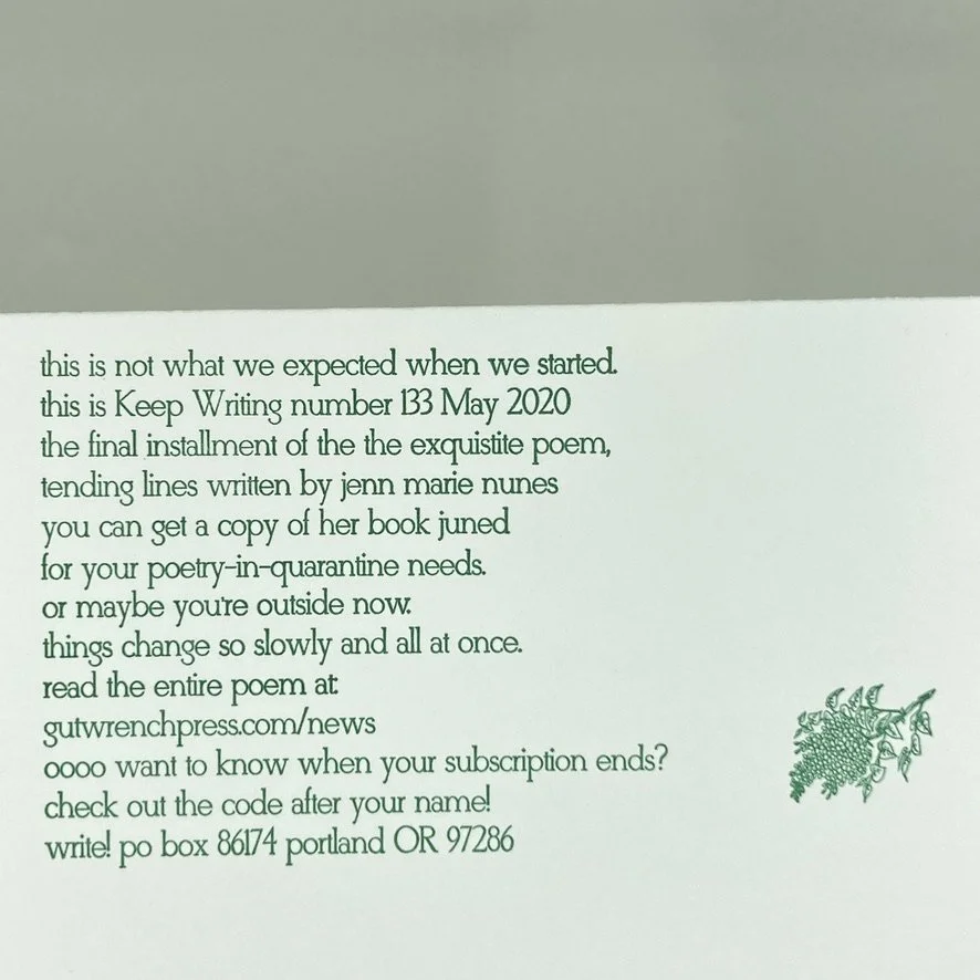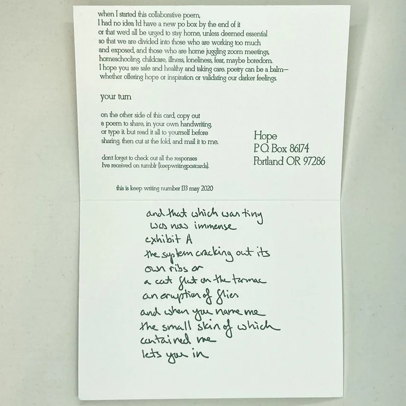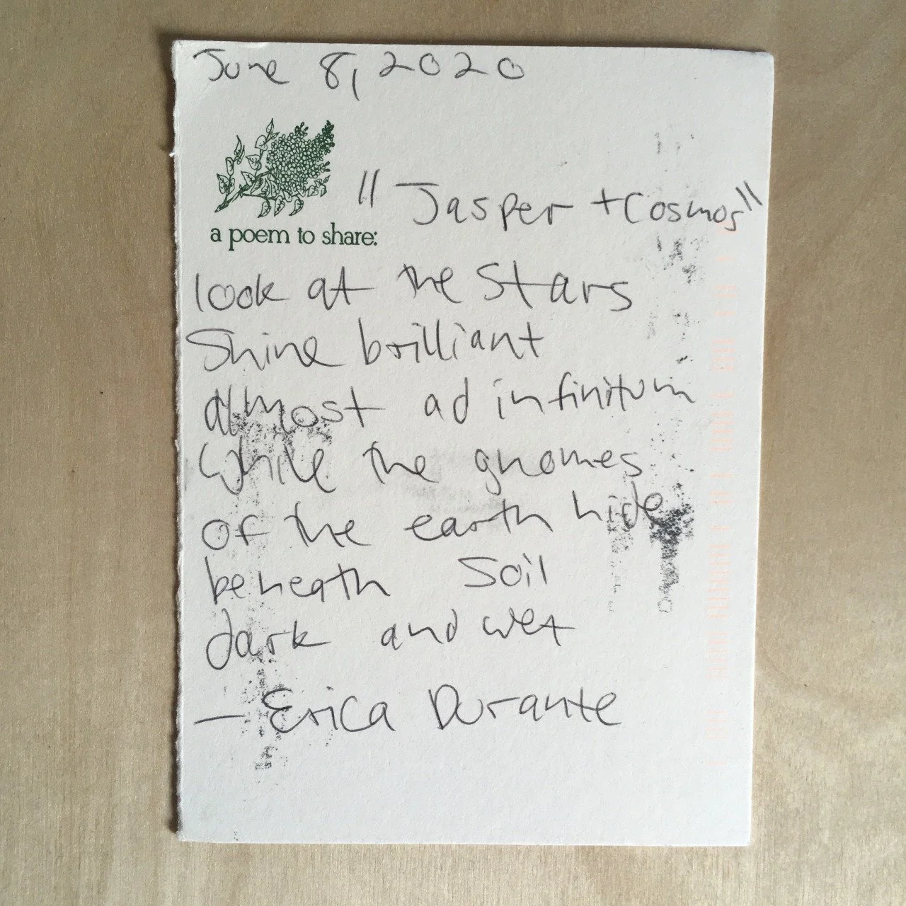 I moved to Portland, COVID shut everything down, and we all tried to adjust. The exquisite corpse poem was on hold, as I was seeking studio space for printing, and awaiting a post office box. This is the first card printed on my tabletop press, that I brought with me, in my new studio space in Portland.
