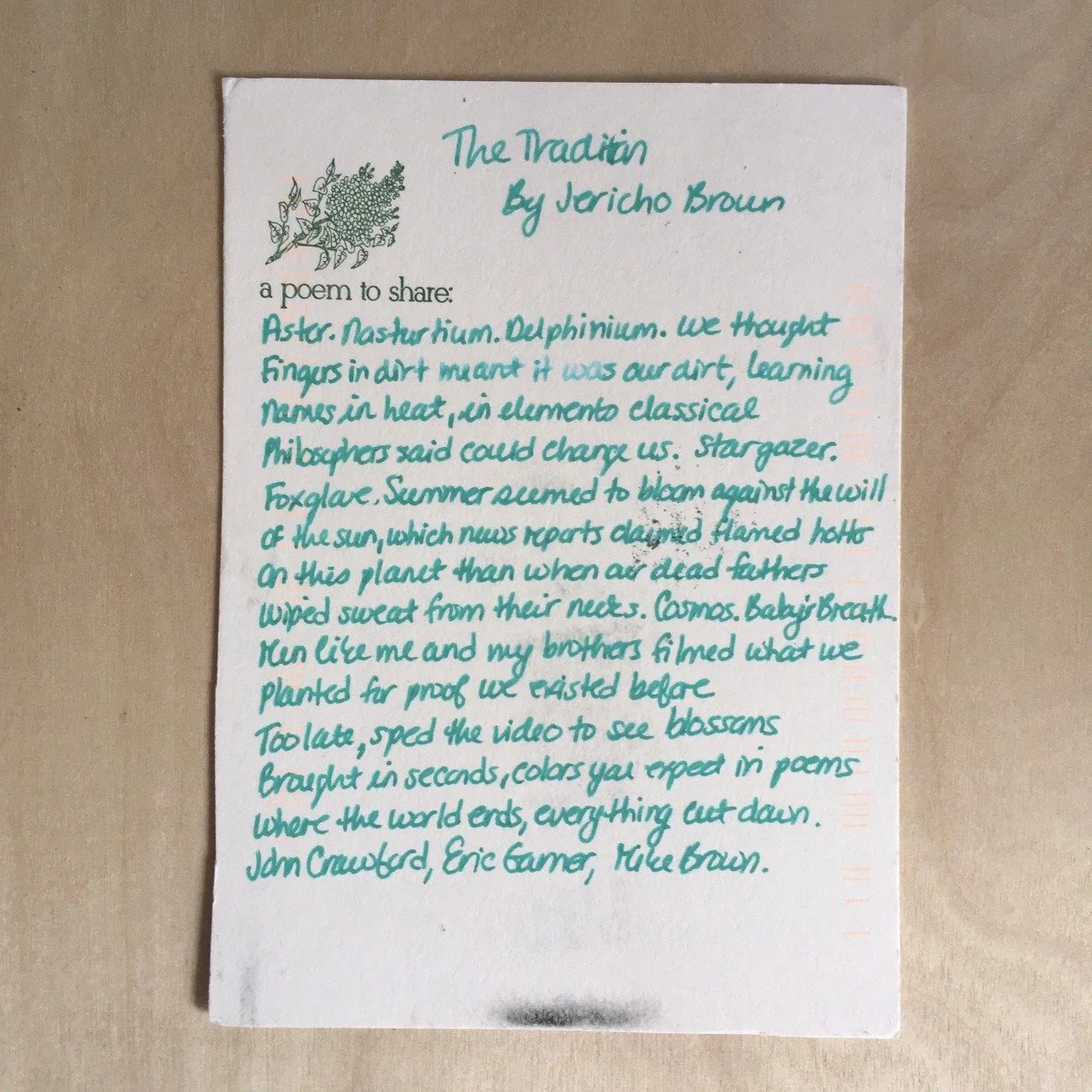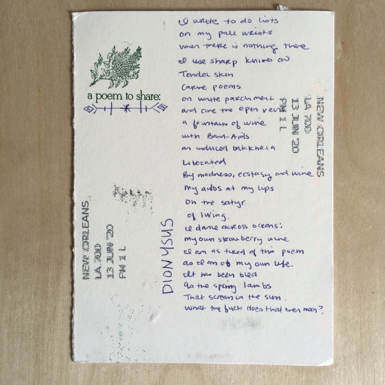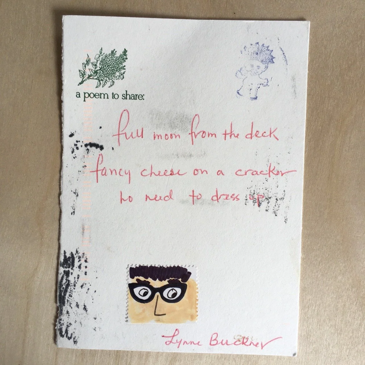 I moved to Portland, COVID shut everything down, and we all tried to adjust. The exquisite corpse poem was on hold, as I was seeking studio space for printing, and awaiting a post office box. This is the first card printed on my tabletop press, that I brought with me, in my new studio space in Portland.