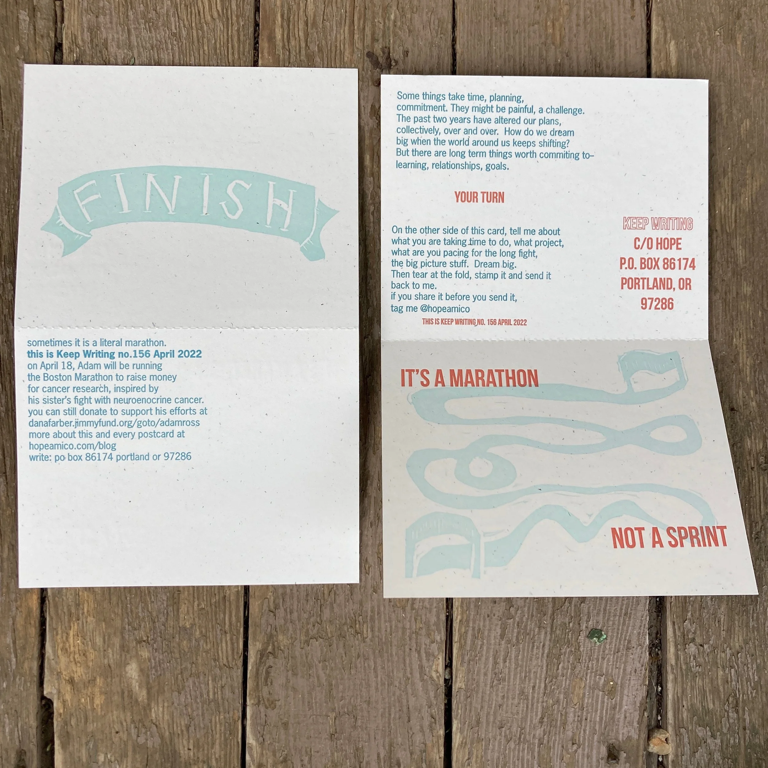 My partner at the time had was running the Boston Marathon as a part of Dana-Farber Marathon Challenge, raising money for the Dana Farber Cancer Institute for Research. As one of his fundraising events, I printed this card, and we hosted a collage meet up, accepting donations. He reached his goal AND the finish line.