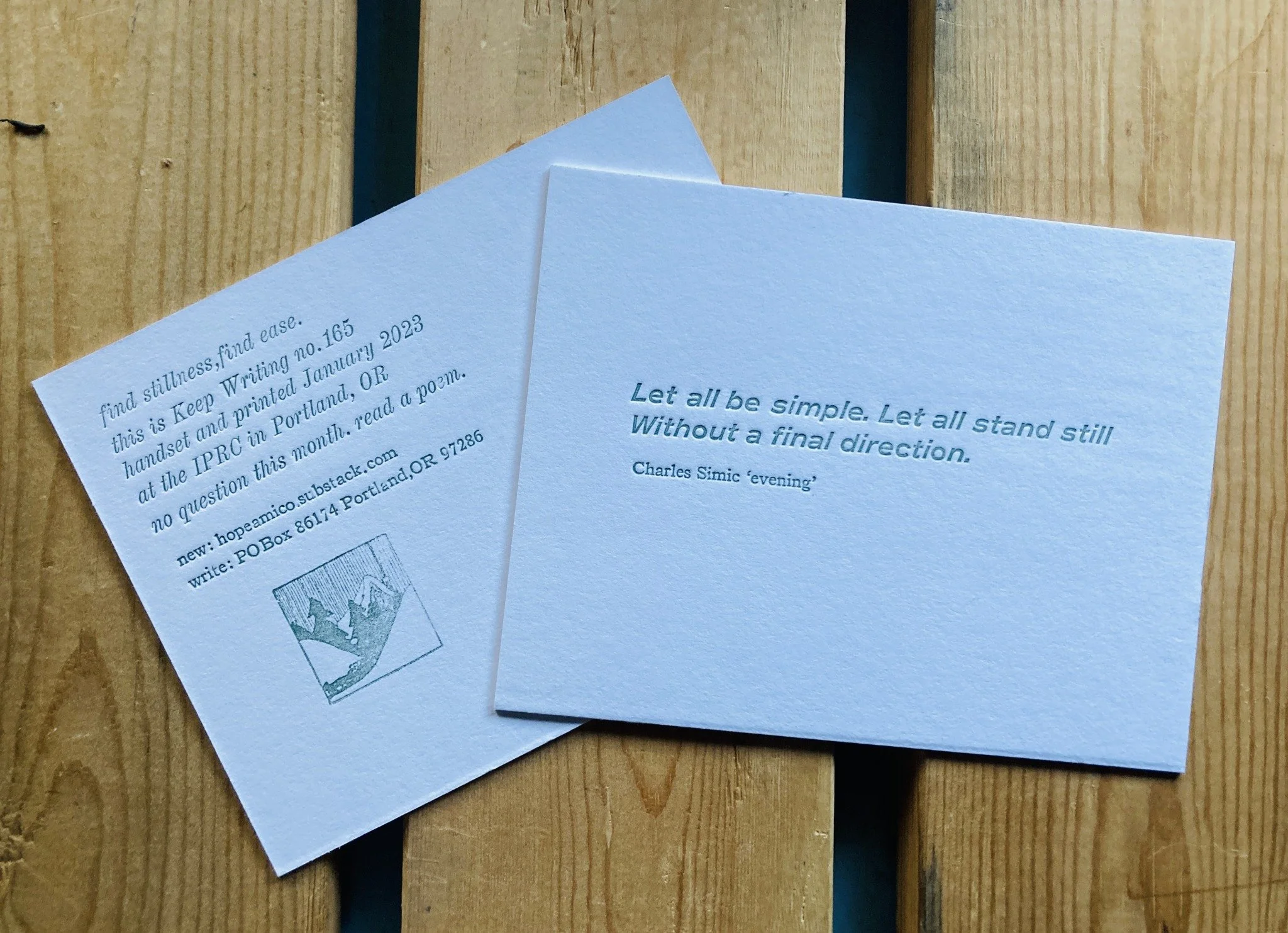 No prompt this month, just some poetry from the late Charles Simic, printed with handset type at Independent Publishing Resource Center on cranes lettra paper.