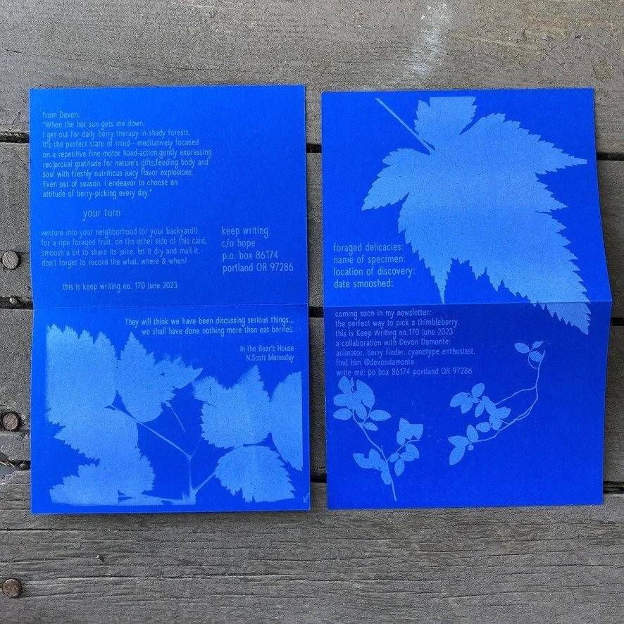 Devon Damonte makes cyanotypes and forages for berries. He shared some cyanotypes, and I figured out how to translate them to riso, using white ink, blue Neenah Paper, and help from Outlet in Portland. Still one of my favorite prints.