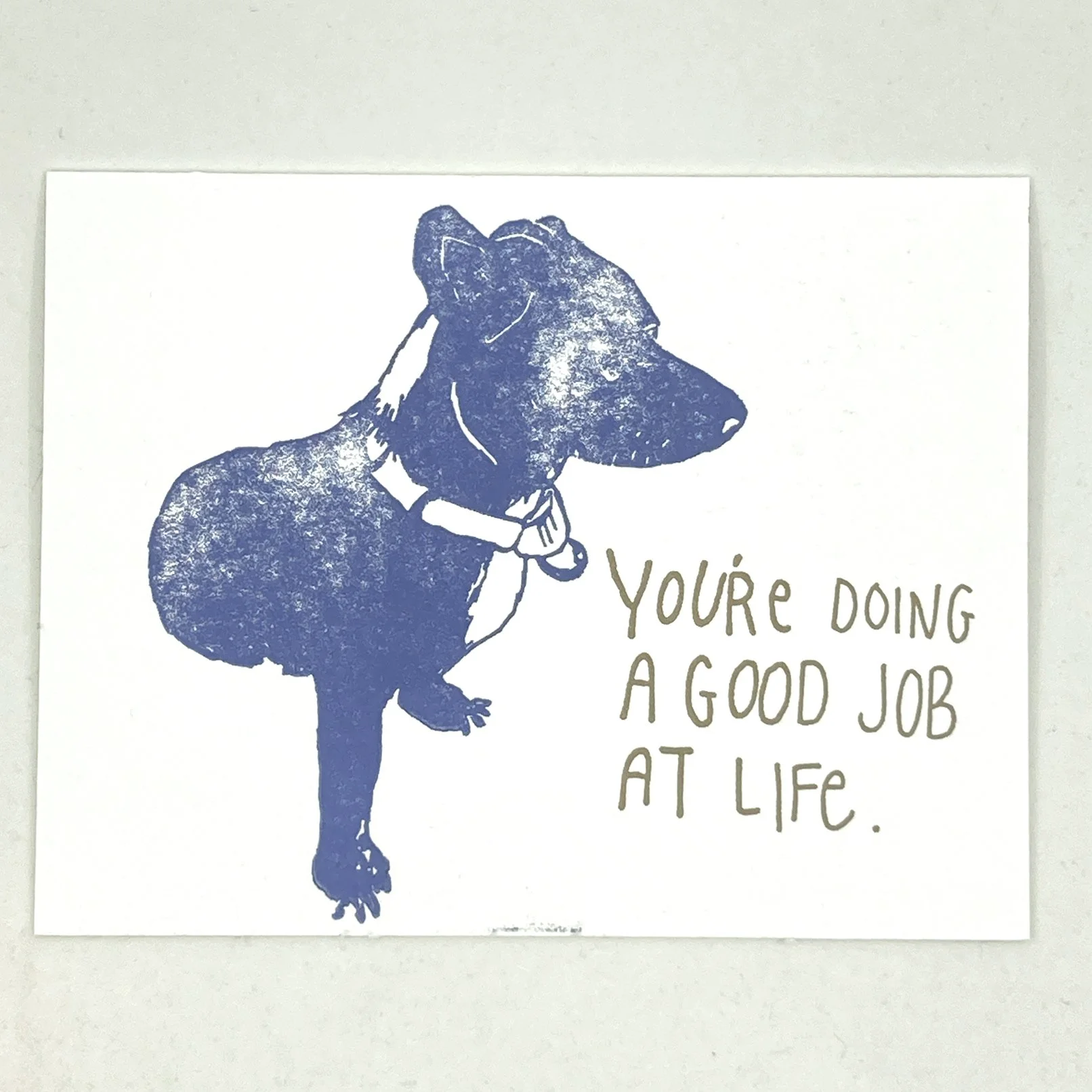 This month, I wanted to redesign a card I had printed years ago with inspiration from my former roommate, Bear Hebert. The original design is card #XX but I wanted to update it with my doggo. Additionally I wanted to design a card I could print on my little Kelsey Tabletop.