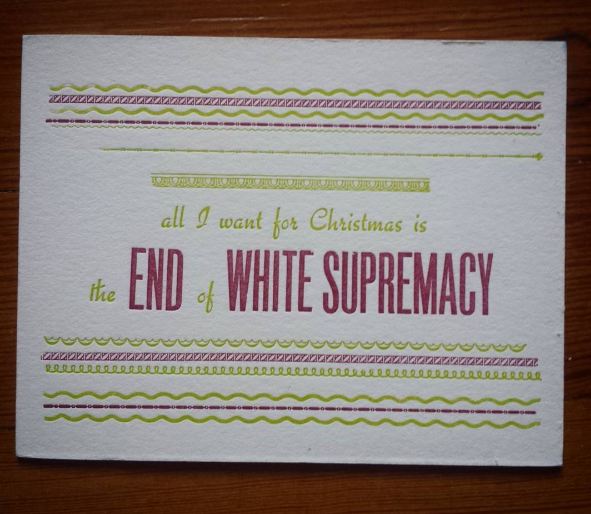 When The Southern Letterpress sent an email to a bunch of letterpress printers a few days after the election asking us to use the tools we had to protest, it was exatly what I needed. Yes, the first draft of this was "FUCK YOU RACIST AMERICA happy holidays" but printing this with others in the shop at Bakerville and exchanging prints with Blackbird Letterpress and FItzgerald Letterpress, I am reminded of the best part of letterpress printing--making lots of something and sharing it.