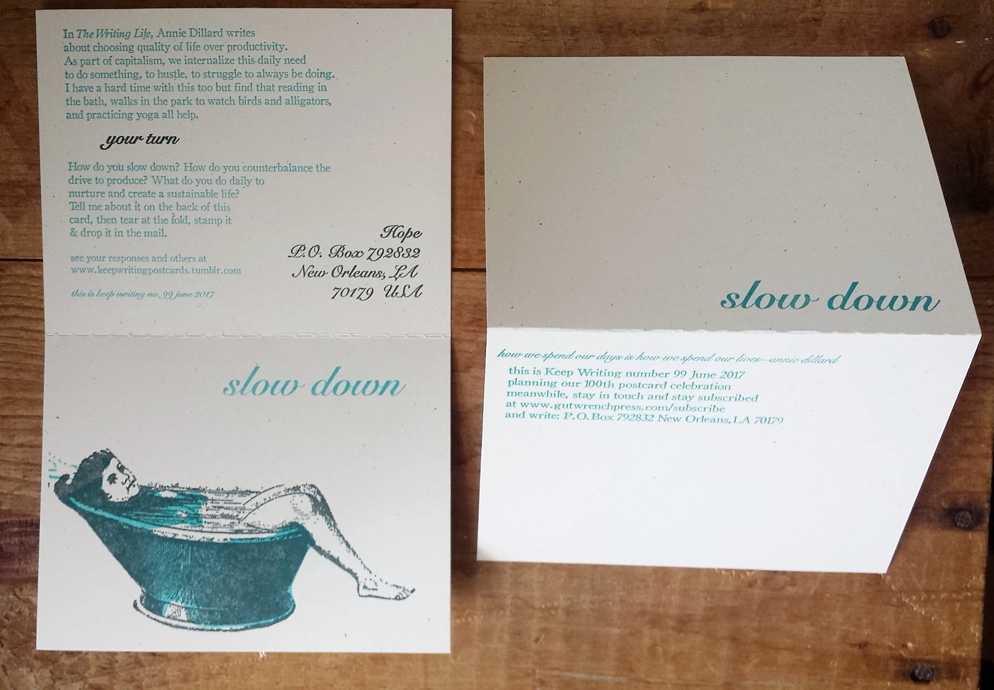 How do I do that? One, is that I have been mentally reframing my work, refusing the constant talk of hustle. The letterpress printers I know love the idea of the hustle but I was never sold on it. Which might be why I have a smaller business, focusing on postcards instead of wholesale greeting cards, and balancing a few part-time jobs. The balance of time and money and creative endeavors is real and for now I still choose the flexibility and inconsistencies of part time work over a full time job.