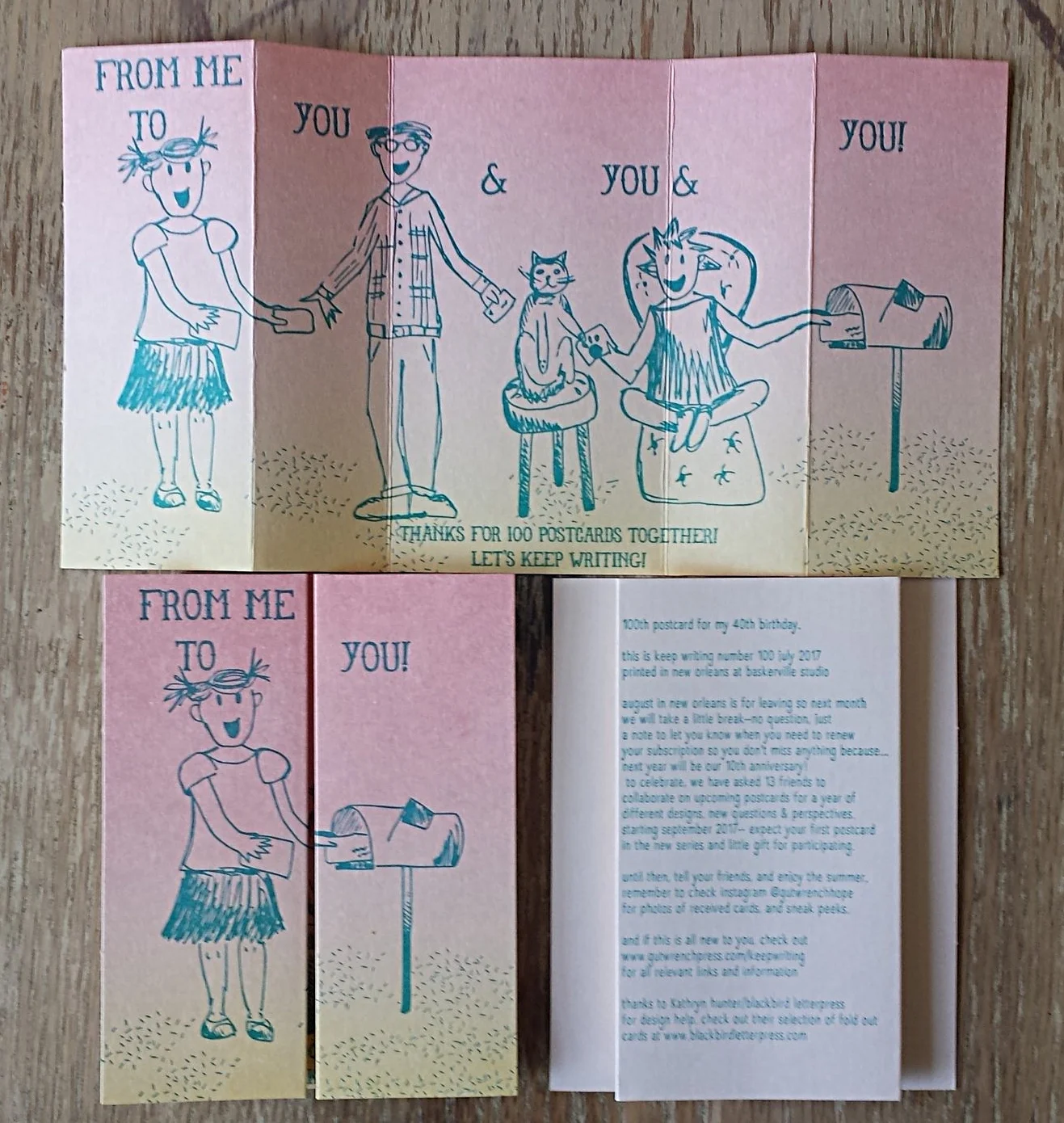 Did I think I would be celebrating 100 postcards that day I was biking home in the Baton Rouge humidity? I knew I had thought of something that made sense of all the parts of me, something I was excited about. Now here I am with multiple birthday cakes (and I turned 40!) and a pile of mail to answer.
